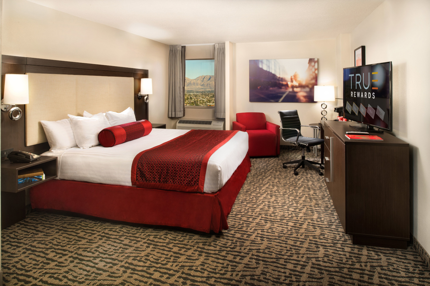 The Elite King is 340 square feet and includes one king bed. Rooms feature a mini fridge, 55-inch TV and in-room safe. For those who need to work while they play, the room includes a designated work area with desk. The perfect room to catch what little sleep awaits.